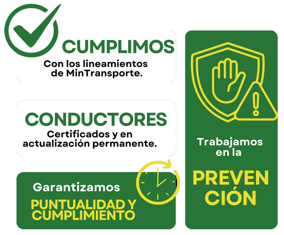 Brindar un servicio de transporte especial seguro, confiable y de alta calidad, cumpliendo con la normatividad vigente, comprometidos con el bienestar de nuestros colaboradores, la protección del medio ambiente y la satisfacción de las necesidades de nuestros clientes. Hoy nos afianzamos como una de las mejores empresas de transporte especial de la región, contando con un excelente parque automotor, conductores capacitados, organización, cumplimiento y seguridad en los servicios
